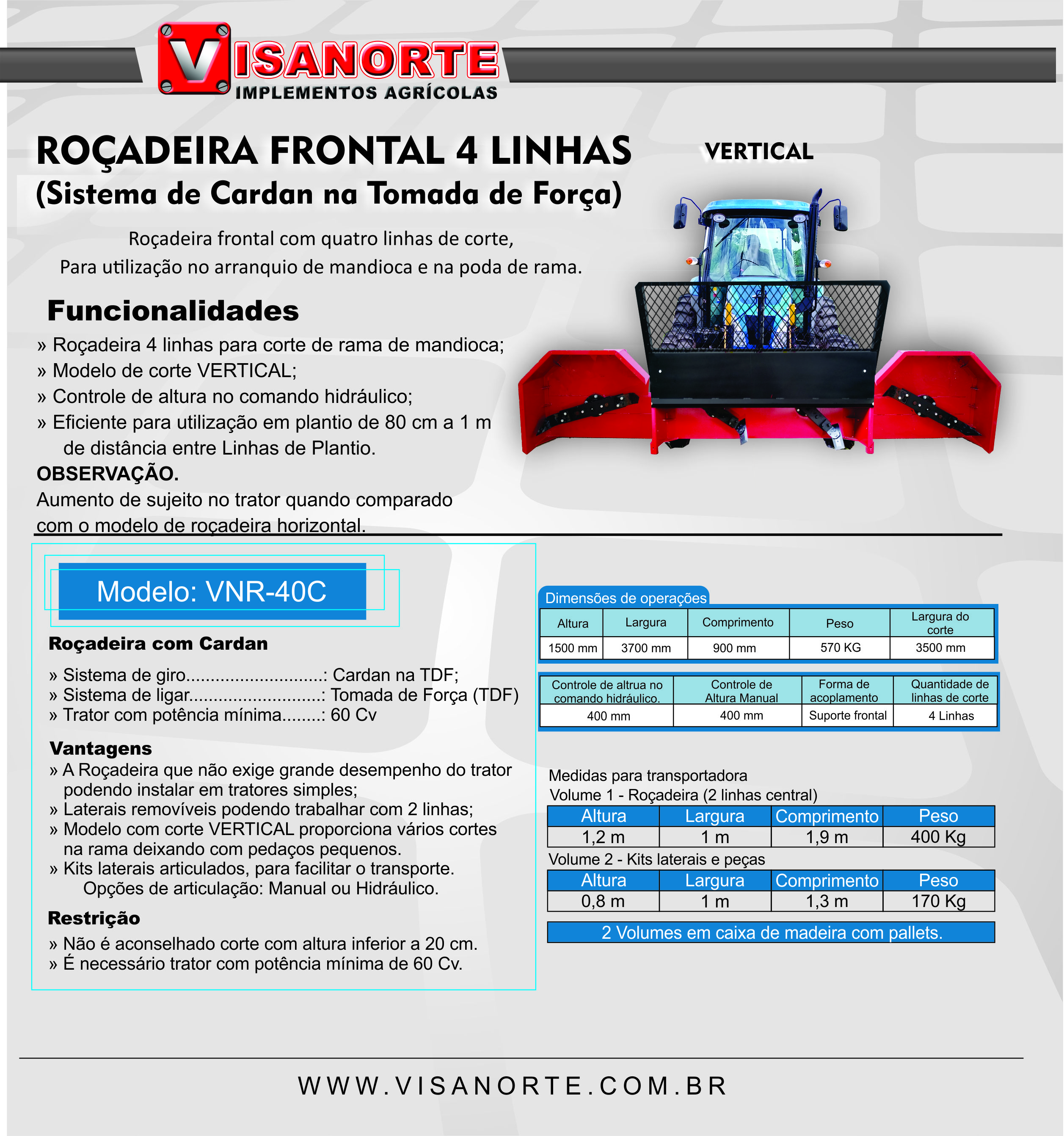 A VISANORTE implementos agrícolas tem uma linha de roçadeiras frontais para mandioca, com a qualidade necessária para executar um trabalho rápido e eficiente. Um produto confiável para a sua tranquilidade. A utilização da tomada de força é necessário para que a roçadeira possa trabalhar em roças sujas. Com um corte rápido e sem abalar o pé, pode ser usada para o momento de arrancar quanto para a poda da mandioca. Temos excelentes opções para trabalhar com os mais diversos modelos de tratores. Temos o produto certo para você