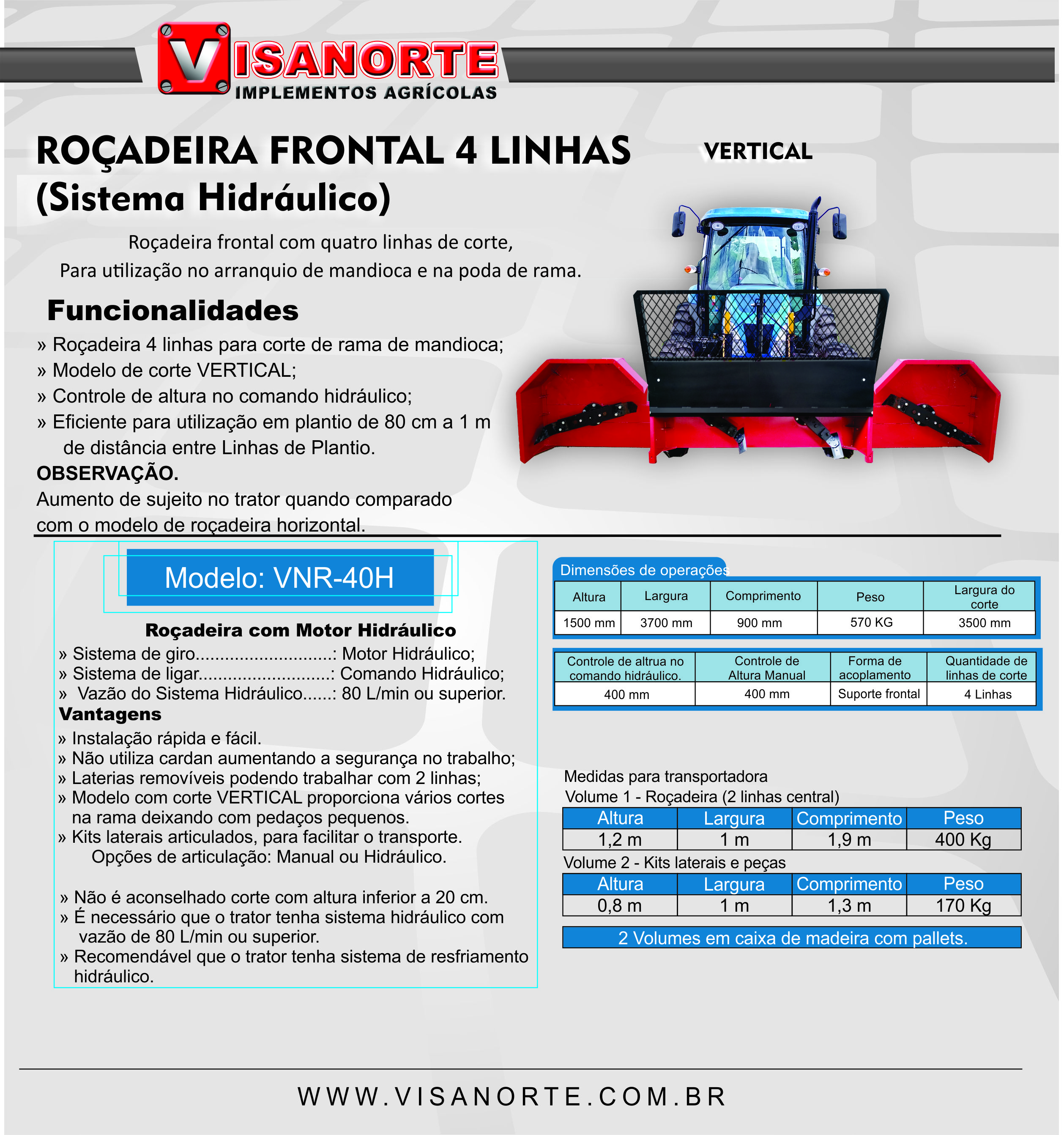 A VISANORTE implementos agrícolas tem uma linha de roçadeiras frontais para mandioca, com a qualidade necessária para executar um trabalho rápido e eficiente. Um produto confiável para a sua tranquilidade. Com um corte rápido e sem abalar o pé, pode ser usada para o momento de arrancar quanto para a poda da mandioca. Temos excelentes opções para trabalhar com os mais diversos modelos de tratores. Temos o produto certo para você